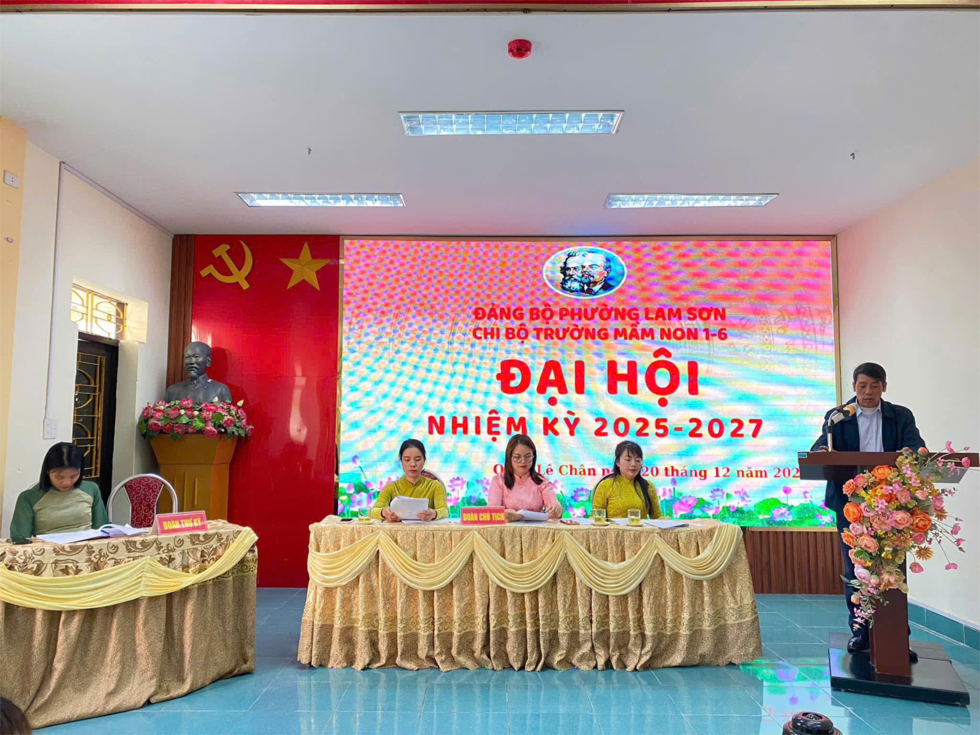 Thực hiện sự chỉ đạo, hướng dẫn tổ chức Đại hội các chi bộ trực thuộc của Đảng bộ phường Lam Sơn nhiệm kỳ 2025-2027, sáng ngày 20/12/2024, Chi bộ trường mầm non 1-6 đã long trọng tổ chức Đại hội Chi bộ nhiệm kỳ 2025-2027. Đến dự và chỉ đạo Đại hội có đồng chí Đặng Văn Điểu - Bí thư Phường Lam Sơn và toàn thể các đồng chí Đảng viên của Chi bộ.