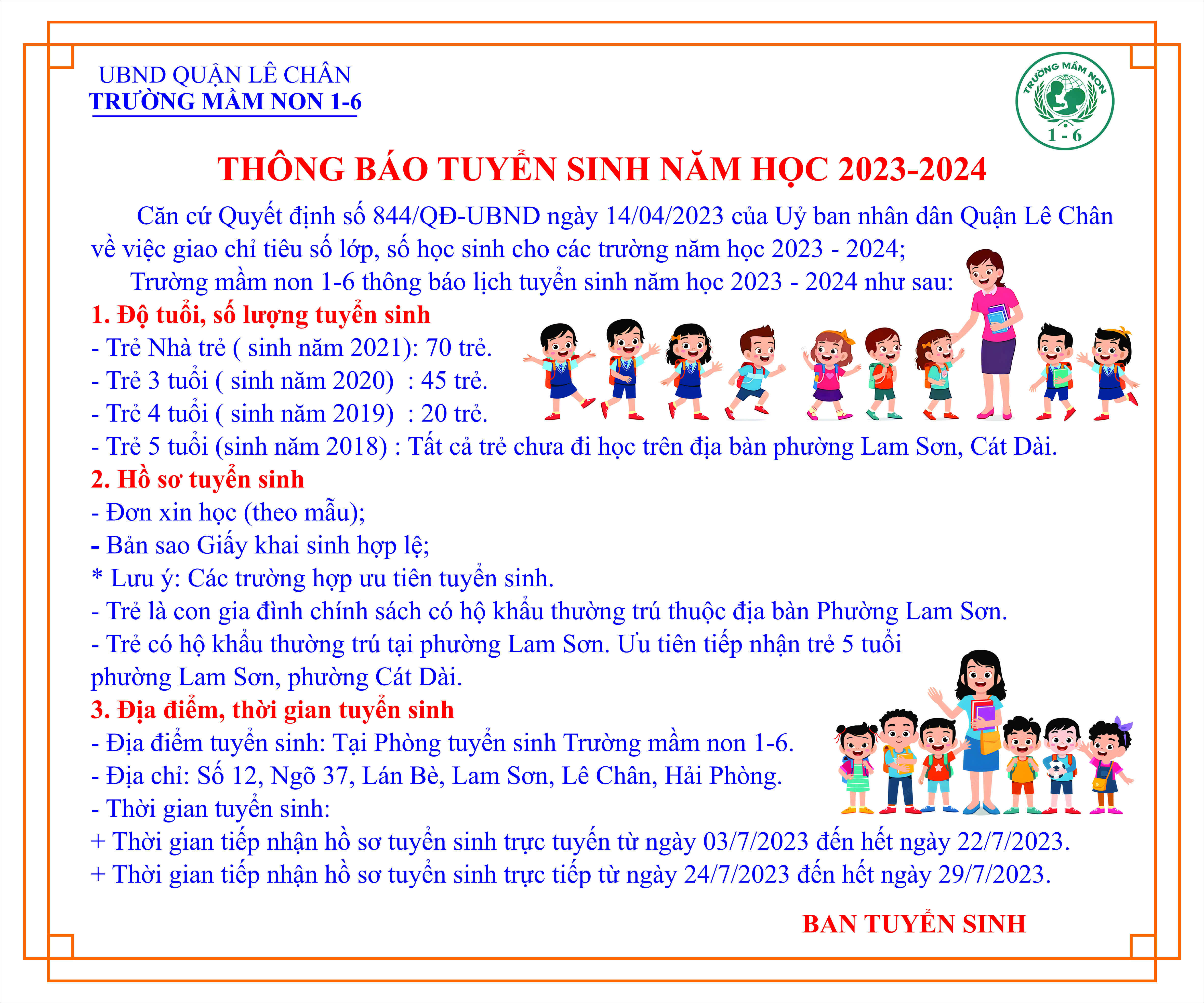 Căn cứ Quyết định số 844/QĐ-UBND ngày 15/5/2023 của Uỷ ban nhân dân Quận Lê Chân về việc giao chỉ tiêu số lớp, số học sinh cho các trường năm học 2023-2024; Ban giám hiệu trường Mầm non 1-6 lên kế hoạch tuyển sinh năm học 2023-2024, số lượng như sau: